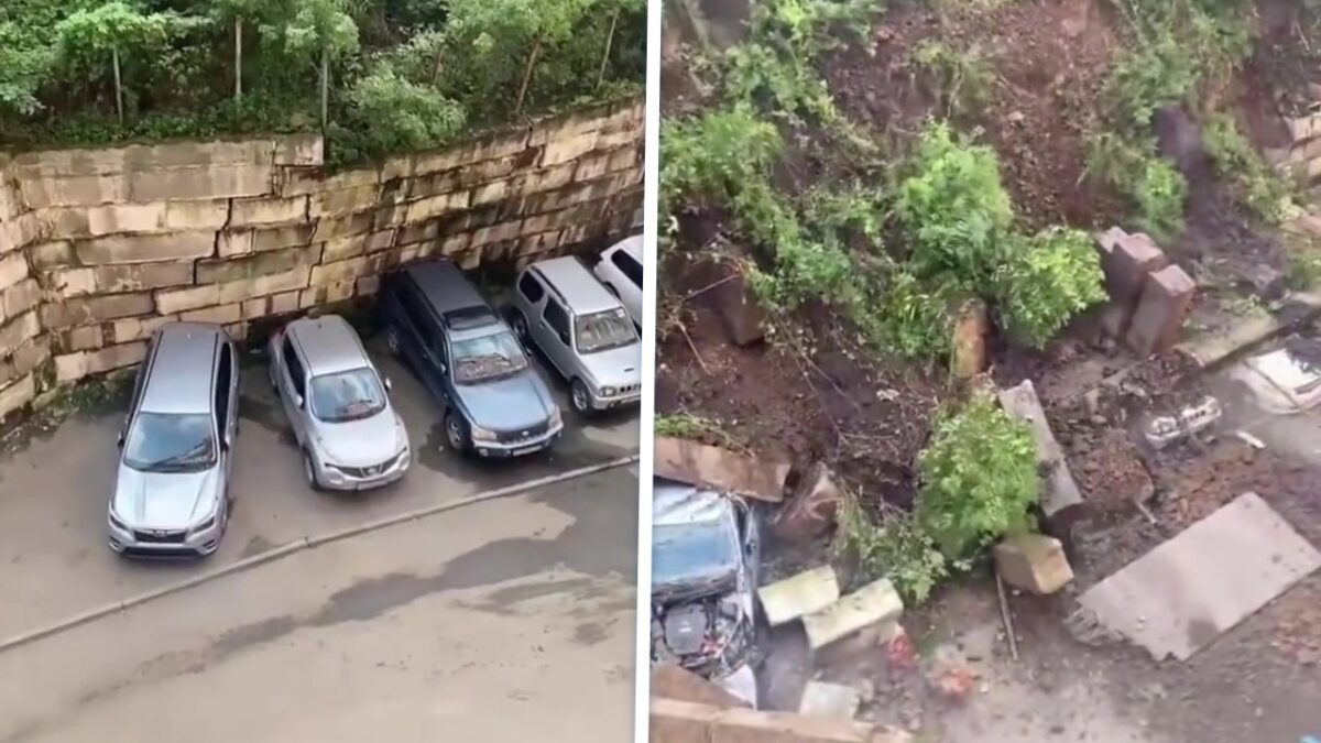 Autorijder vertrouwt op zijn instinct en ontsnapt aan instortende muur in Vladivostok