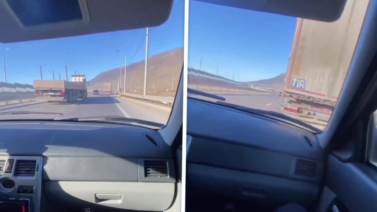 Verkeershufters hebben bijna allemaal dezelfde eigenschap: enorme zelfoverschatting van de eigen rijkunsten. Zo dacht deze prutser een vrachtwagen rechts in te halen maar vergat hij even dat op de rechterbaan OOK vrachtwagens te vinden zijn en dat die niet zo hard rijden. Zo te horen komen beide inzittenden met de schrik vrij, we vermoeden dat 'ie vanaf dit moment keurig netjes links inhaalt.