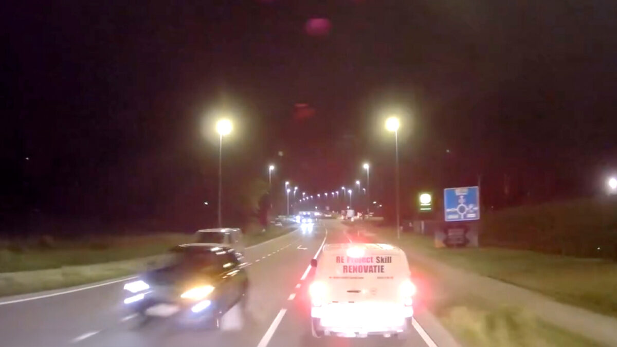 Asociaal busje draait vlak voor vrachtwagen de weg op en deelt óók een brake check uit