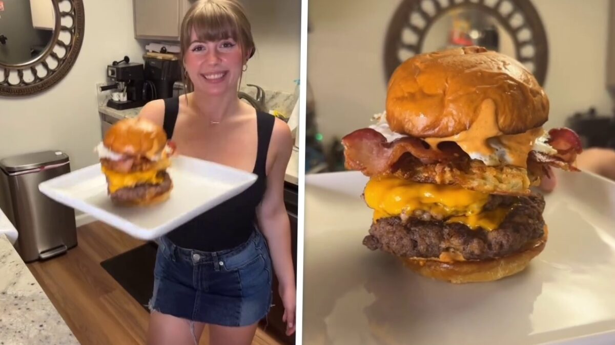 Deze keukenprinses stopt twee overheerlijke burgers met gesmolten Amerikaanse kaas, knapperige bacon, geraspte hashbrowns met uien, een spiegelei en sriracha-mayonaise op een zacht briochebroodje. Als dat niet smullen wordt.