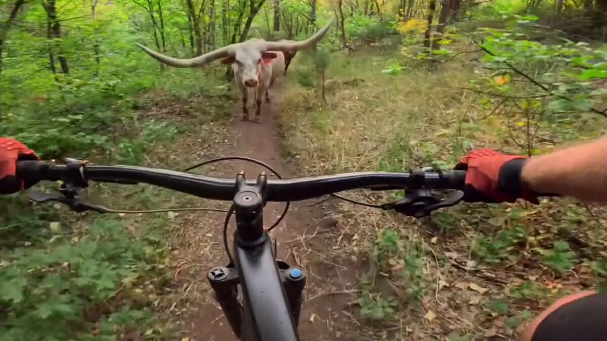 Mountainbiker moet vol in de ankers omdat een Texas Longhorn zijn weg blokkeert