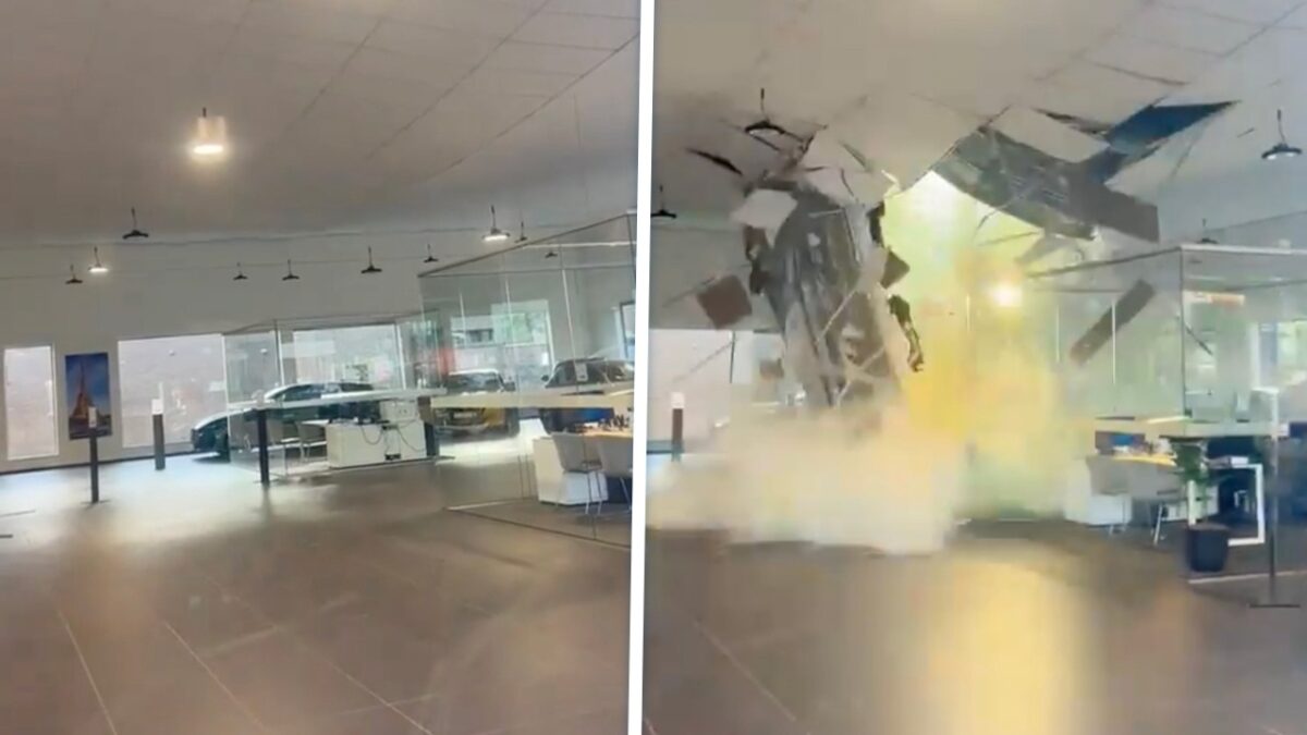 Volgens de brandweer is er zo'n 10.000 liter regenwater naar beneden gekomen. De twee glazen kantoren zijn in duizenden stukjes uit elkaar gespat en de showroom staat vol met water. Gelukkig hebben ze op het nippertje nog wel 5 of 6 auto's schadeloos naar buiten kunnen gereden.