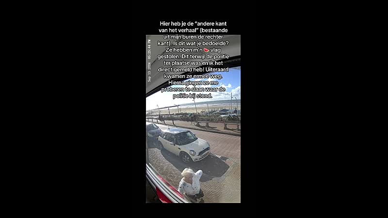 Een vrouw ligt duidelijk overhoop met haar buren en dat wordt pijnlijk duidelijk dankzij de camera's die zij heeft opgehangen. In de eerste video is duidelijk de buurvrouw te zien die het op haar Palestijnse vlag heeft gemunt. Ze loopt er recht op af, trekt hem van de muur en gooit hem demonstratief in de prullenbak. In de tweede video stapt de vrouw, die ondertussen de politie heeft ingeschakeld, in haar auto maar wordt dan belaagd door meerdere mensen. Wat precies de aanleiding is voor deze ruzie is niet duidelijk, maar dat ze het niet naar hun zin hebben is wel duidelijk.