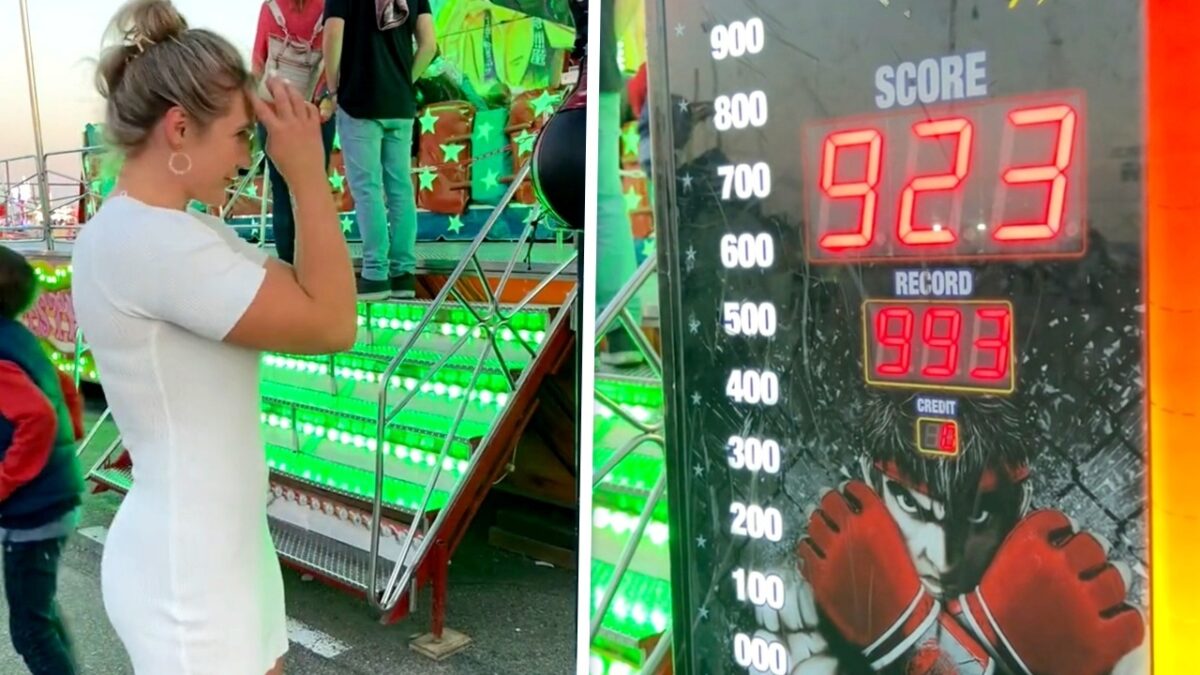 Dat ze meer in huis heeft dan alleen een mooi uiterlijk, bewijst ze door op een boksautomaat op de kermis bijna een highscore te halen. Sorry schat, ik doe de afwas wel!