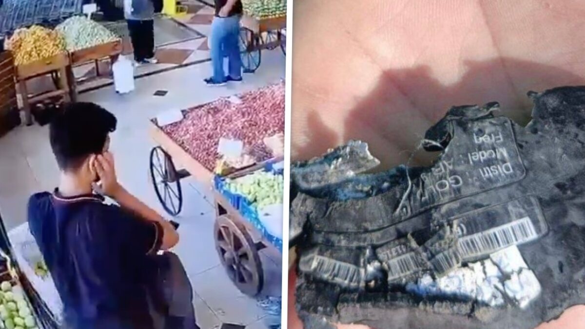 De eigenaar van deze pieper had geluk; hij had hem niet bij zich maar het ding lag op een bureau. Het gat laat zien wat voor kracht er achter de explosie zat.