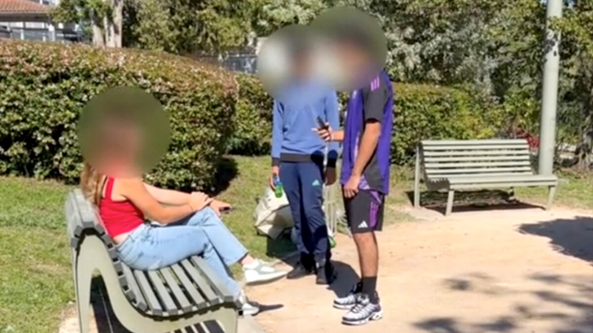 Man en hond schieten vrouw te hulp die wordt lastiggevallen door twee mannen