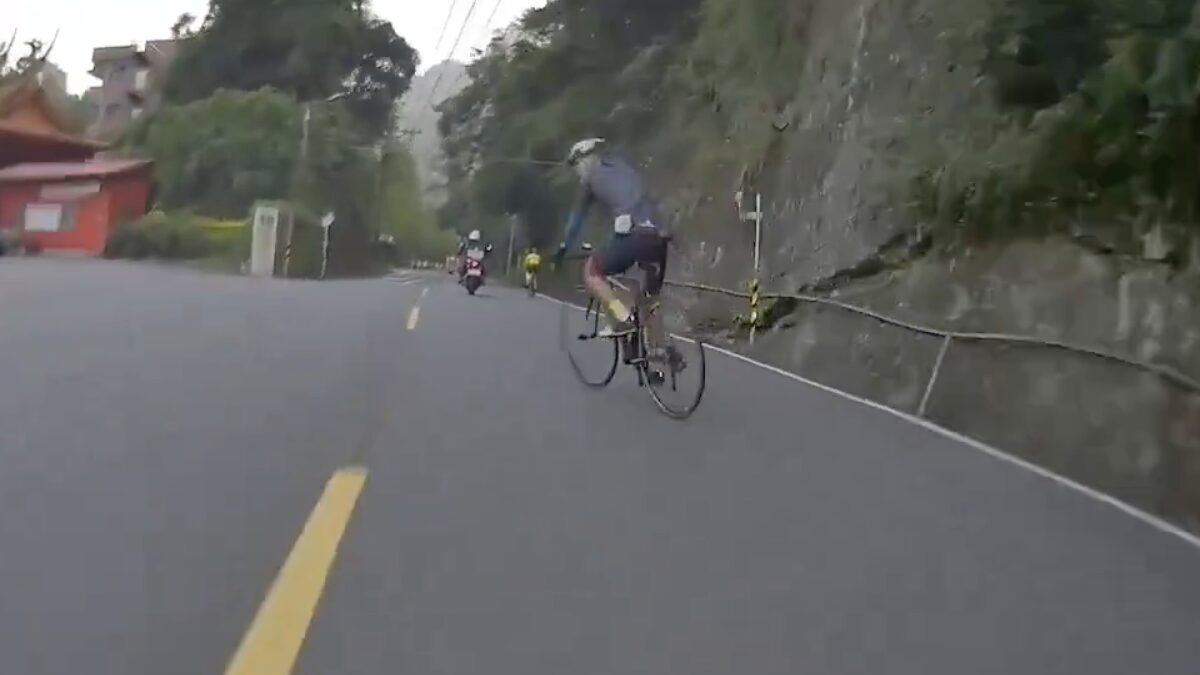 In andere, waaronder Taiwan, is er maar zelden een goed fietspad te vinden en moet je de weg gewoon delen met het overige verkeer. Dat kan prima werken, maar dat wordt wat spannender als je een bergafdaling pakt. Dan moet je altijd scherp blijven, helemaal als je een afslag moet pakken. Dat was duidelijk niet het geval bij deze wielrenner. Hij kijkt niet, steekt geen hand uit en besluit gewoon naar links te gaan. Het gevolg: een auto die met ruim 70km/uur hem aanrijdt.
