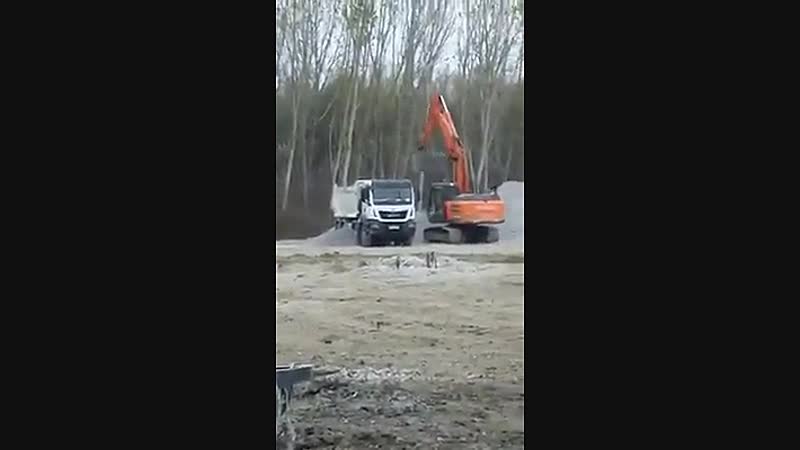 De vrachtwagen vol zand laden is niet de meest spannende klus ooit, en dankzij schele Bennie op de graafmachine duurt het al met al nog knap lang ook.