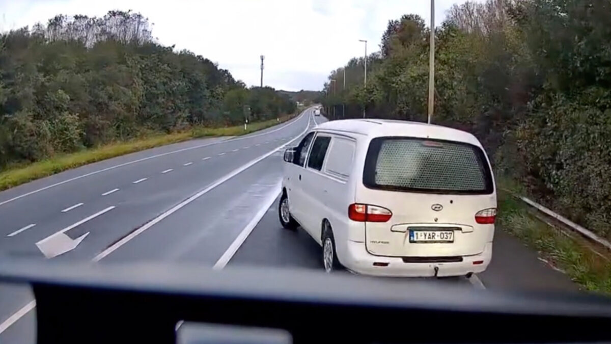 We gaan weer even kijken in België waar een verstrooide Hyundai-bestuurder ineens bedenkt dat hij niet naar rechts maar naar links wilde afslaan. Ieder normaal mens zou een klein stukje doorrijden om te zien of je ergens fatsoenlijk kunt keren zonder dat je de rest van het verkeer tot overlast bent, maar deze muppet bedenkt zich geen moment en gooit gewoon z'n stuur om.