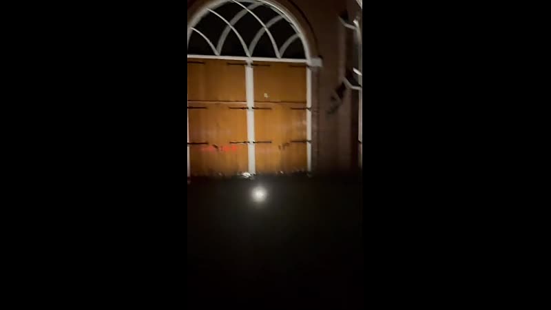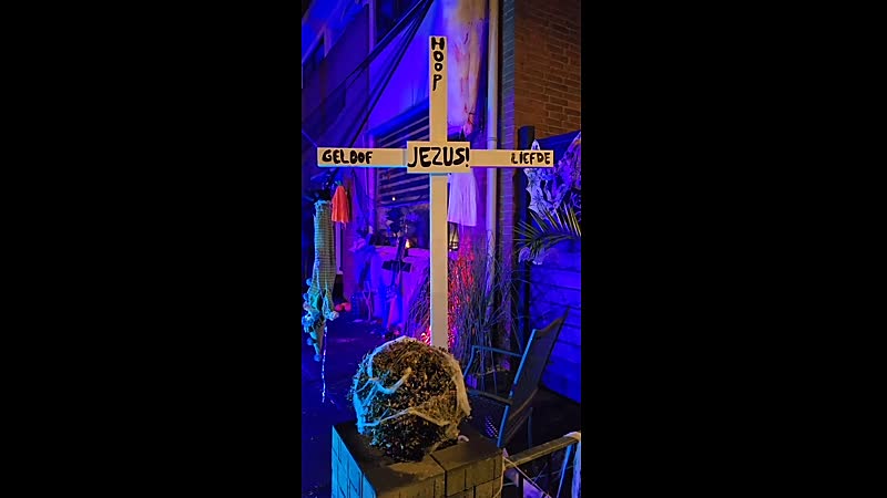 Boze gelovigen plaatsen Jezus-kruis in een voortuin die versierd is voor Halloween