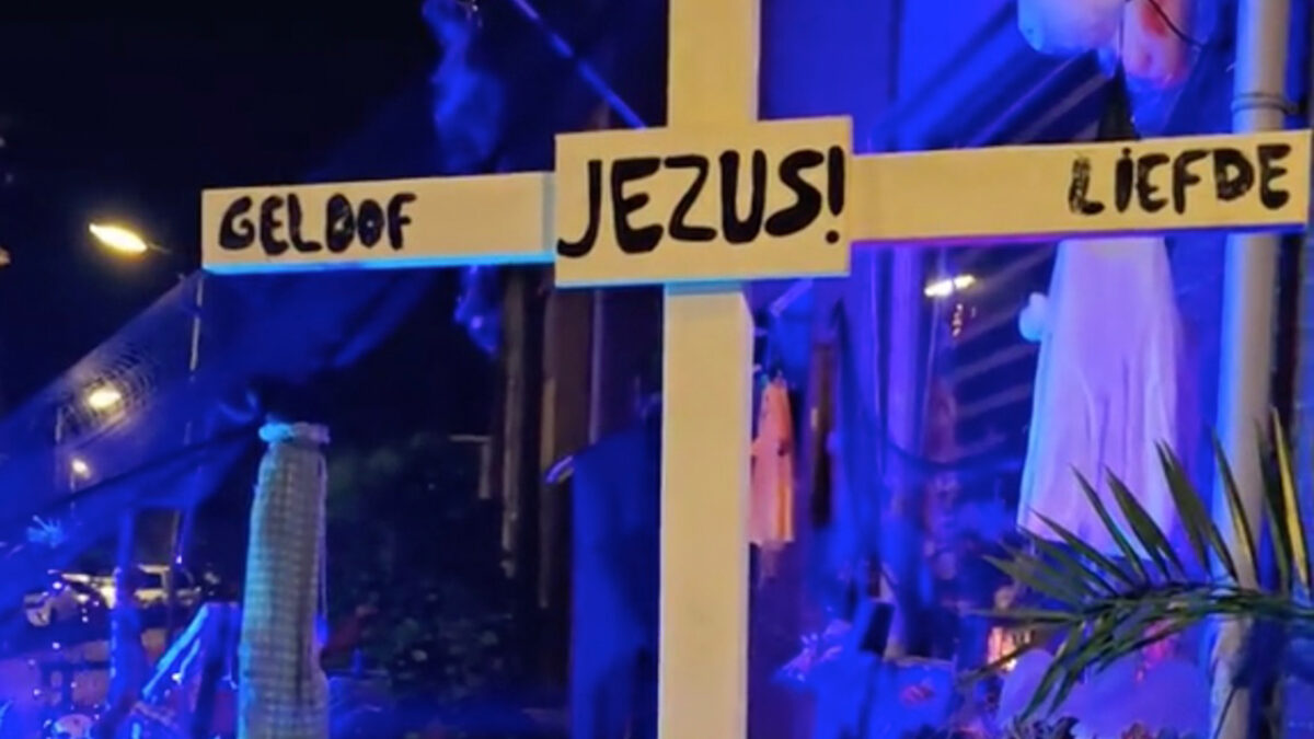 Niet iedereen is hier blijkbaar evenveel van gecharmeerd, maar klaarblijkelijk is er ook een groep (gelovigen) die een tegengeluid wil laten horen. Iets met leven en laten leven zou je denken, maar in dit geval hebben ze een kruis in iemands voortuin geplaatst met de tekst hoop, geluk en liefde.