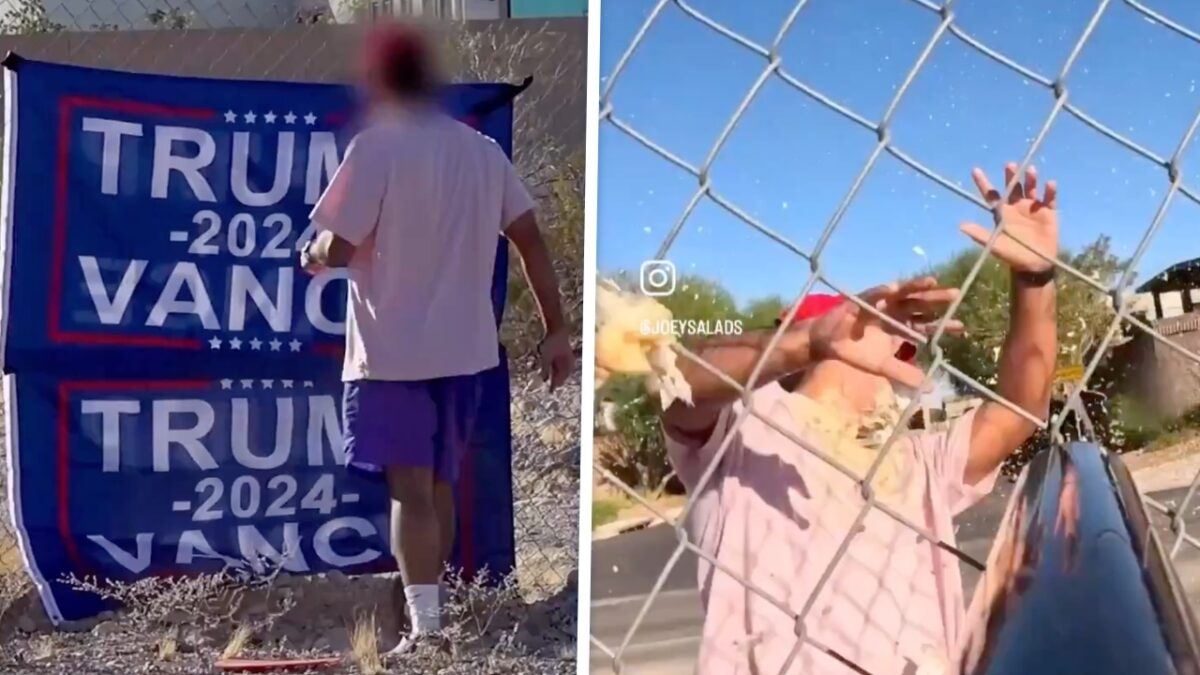 Onlangs zagen we al een aantal Kamala-supporters die met hun auto Trump-bordjes in tuinen sloopten, al scheen dat een "hilarische" skit te zijn van een republikein die hiermee de tegenpartij in een slecht daglicht probeerde te stellen, maar deze keer is een Trump-vlag het spreekwoordelijke haasje.