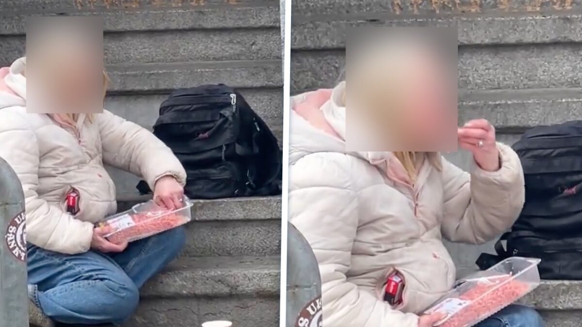 Vrouw eet een kilootje rauw gehakt voor haar dagelijkse dosis eiwitten