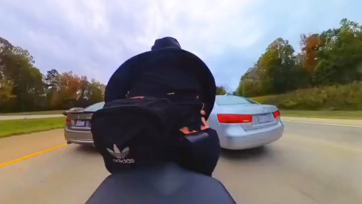 Motorrijdende maniak speelt met zijn leven als hij tussen het verkeer door slalomt
