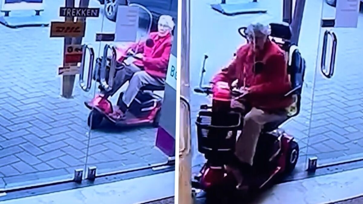 Oma in scootmobiel rijdt glazen deur van winkel aan gort