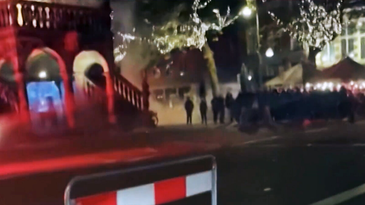 Terwijl ze langs de terrassen liepen, vloog er eerst een rode fakkel hun kant op. En alsof dat nog niet genoeg was, volgde brandend vuurwerk. De moeder, geschrokken door het geknal, stond op het punt te vallen. Haar zoon schoot haar te hulp en besloot verhaal te halen bij een groep van vier tot vijf man.
