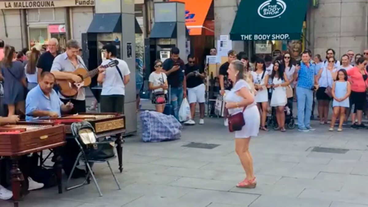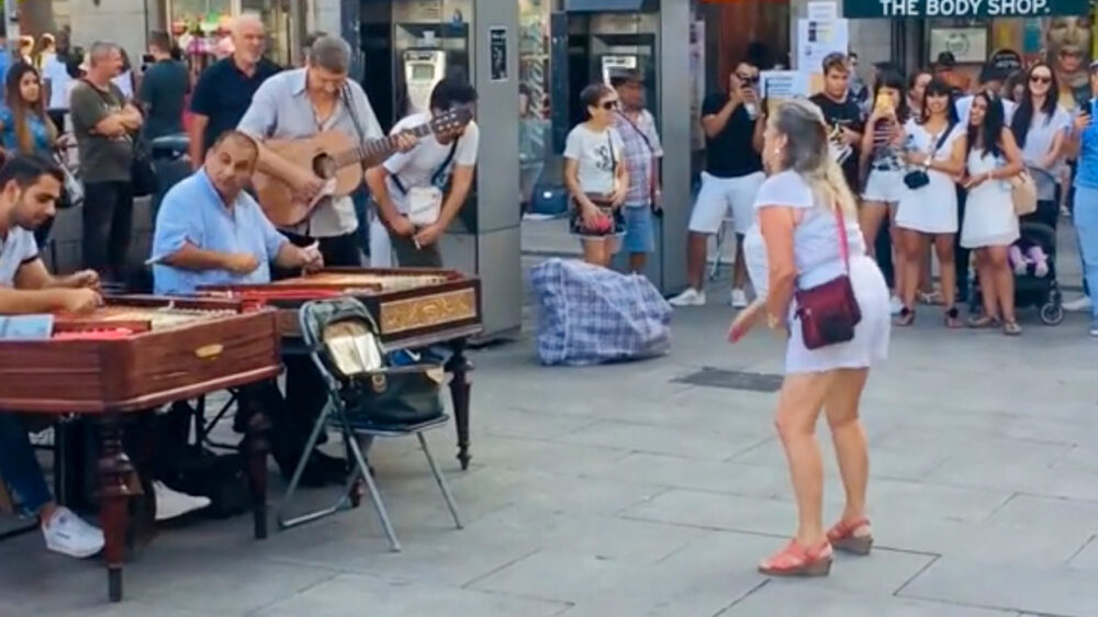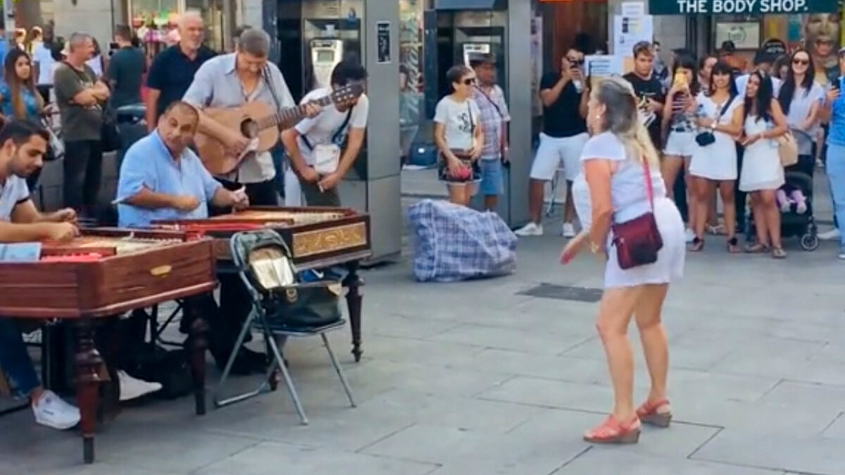 Vrouw zorgt meteen voor een ontspannen sfeer bij wat straatmuzikanten in Madrid
