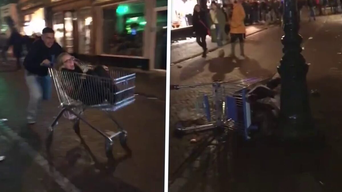 Neem eens een voorbeeld aan deze jonge Casanova die zijn gelukkige scharrel in een winkelwagen knetterhard tegen een lantaarnpaal smijt. Een keer wat anders dan een bosje rozen en een doos bonbons of een suf etentje bij kaarslicht. Ze ziet er gelukkig uit, tenminste voordat haar gezicht de lantaarnpaal kust.