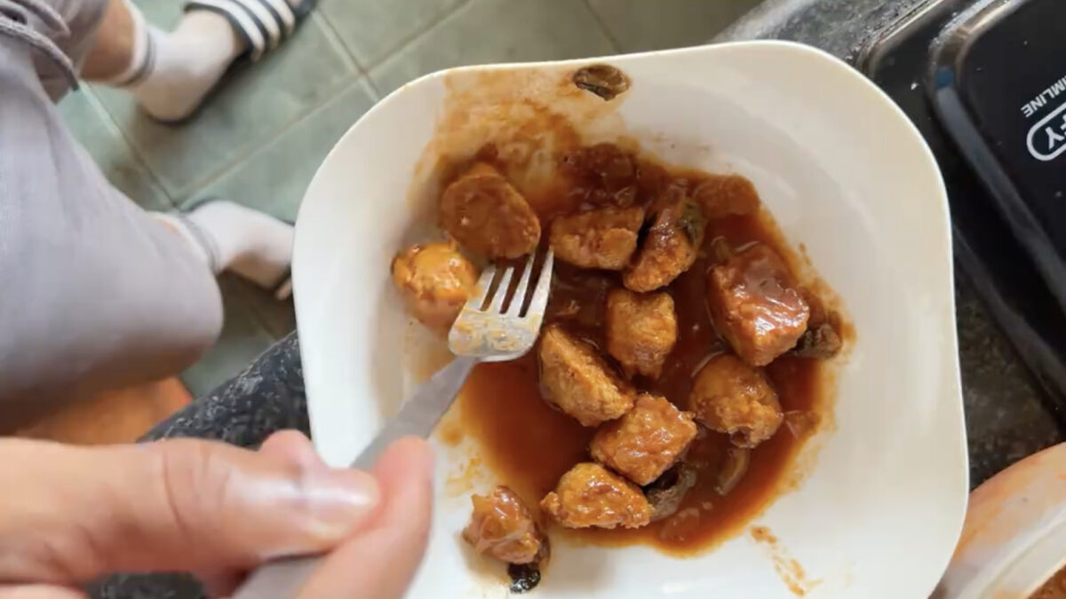 Meneer is druk in de keuken, laat z’n culinaire kunstwerk deels op de vloer belanden, maar hé, voedselverspilling is hier duidelijk geen optie. Dus hup, met de vork van de grond en rechtstreeks naar mevrouw op de bank. Is dit ware liefde of gewoon een briljante interpretatie van haar anti-voedselverspilling motto.