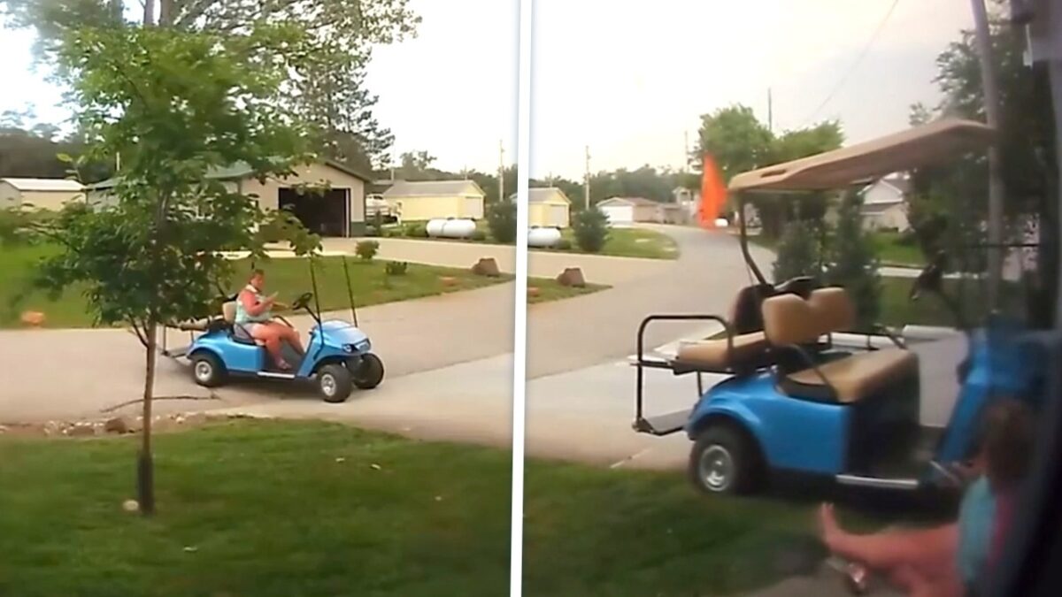 Een golfkar parkeren blijkt bijzonder ingewikkeld met een telefoon in je handen