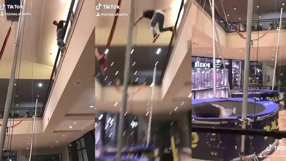 Slecht plan: bezopen waaghals springt van de 1e verdieping op een trampoline