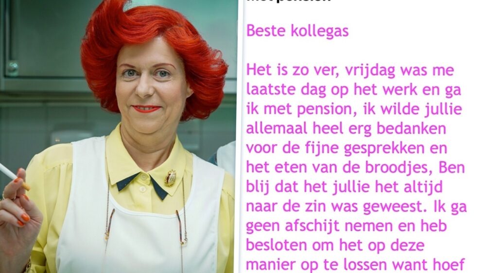 De kantinejuffrouw hangt haar schort aan de wilgen en gaat van haar welverdiende pensioen genieten. Afscheid nemen heeft ze geen trek in, en gelijk heeft ze. Liever glipt ze stilletjes weg, net als de gehaktballen altijd mysterieus leken te verdwijnen tijdens de lunchpauze, maar ze heeft haar "kollegas" gelukkig nog wel een mooie afscheidsmail gestuurd! (Bron: Kakhiel)