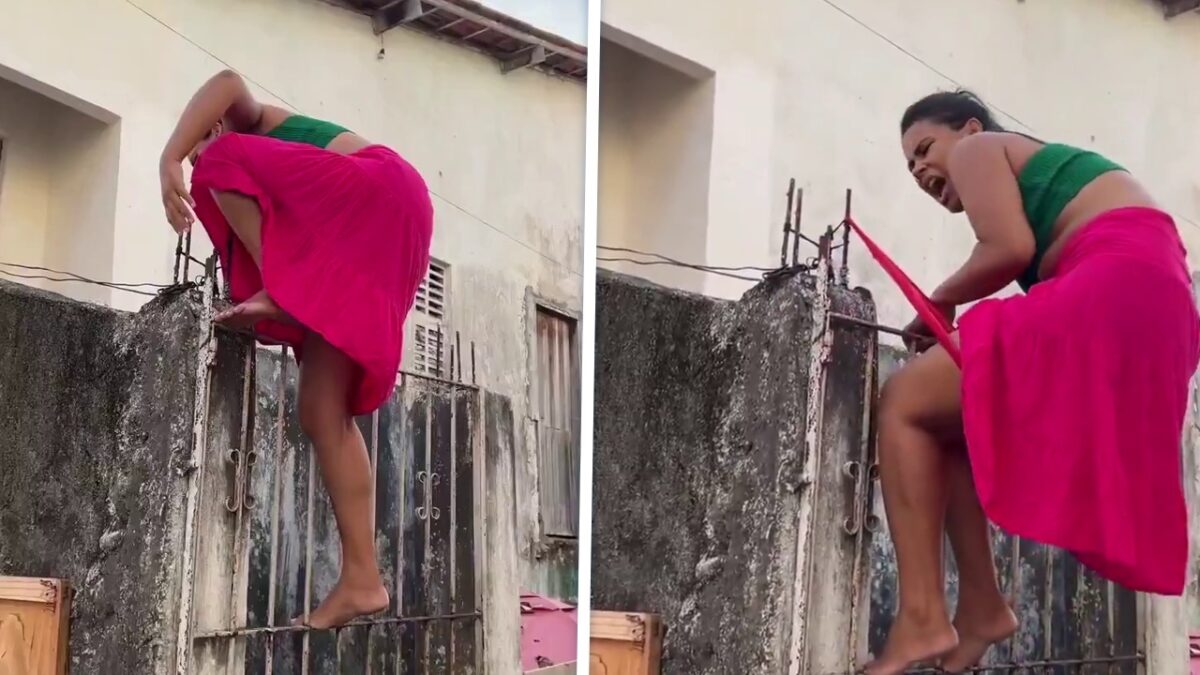 Het idee was simpel: elegant over het hek klimmen, maar plannen lopen vaak anders dan verwacht. Na wat geworstel bleek het hek de duidelijke winnaar, al heeft haar slipje een indrukwekkend staaltje doorzettingsvermogen laten zien. Geen scheurtje te bekennen, terwijl de rest van de actie een complete mislukking was.