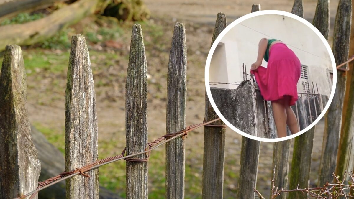 Het idee was simpel: elegant over het hek klimmen, maar plannen lopen vaak anders dan verwacht. Na wat geworstel bleek het hek de duidelijke winnaar, al heeft haar slipje een indrukwekkend staaltje doorzettingsvermogen laten zien. Geen scheurtje te bekennen, terwijl de rest van de actie een complete mislukking was.