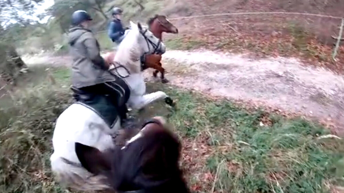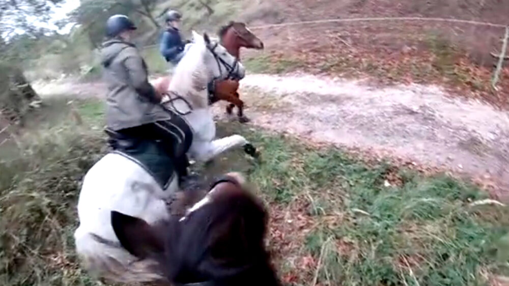 Het leven van een paardenmeisje gaat niet altijd over rozen, of in dit geval, over soepel galopperende ritjes door de natuur. Een jonge ruiter weet dat nu maar al te goed, nadat ze van haar paard werd gegaloppeerd. Met zijn staart tussen zijn benen rent het paard weg, omdat zijn harige vrienden bang zijn voor twee uit de kluiten gewassen koeien. Boehoe!