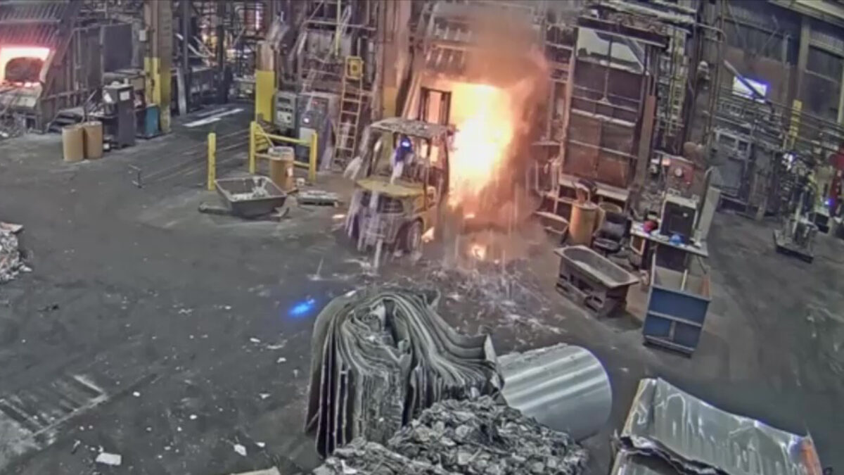Extreme hitte en vocht: niet zo'n heel goede combinatie. Nat metaal in een smeltoven gooien is dan ook iets dat deze werknemer niet snel nog een keer zal doen.