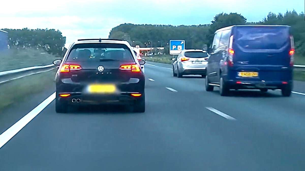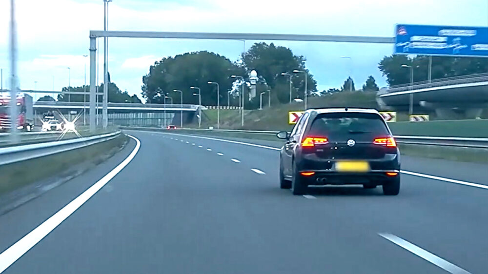 Deze snelheidsduivel in z'n golf trok bij het stoplicht meteen de aandacht door het gaspedaal vol in te drukken. Eerst leek het alsof hij zich bedacht, maar een paar minuten later scheurde hij alsnog langs, compleet met een bumperkleef-act. Niet zo heel gek dat deze onopvallende politiesurveillance besloot hem wat beter te volgen.