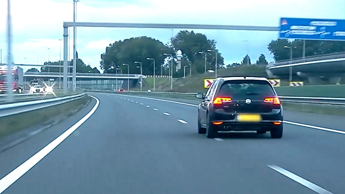 Deze snelheidsduivel in z'n golf trok bij het stoplicht meteen de aandacht door het gaspedaal vol in te drukken. Eerst leek het alsof hij zich bedacht, maar een paar minuten later scheurde hij alsnog langs, compleet met een bumperkleef-act. Niet zo heel gek dat deze onopvallende politiesurveillance besloot hem wat beter te volgen.