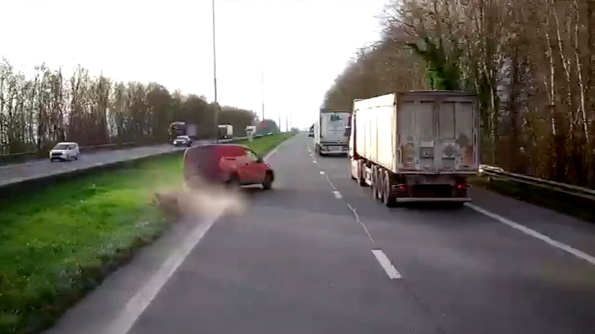 Belgisch busje haalt via vluchtstrook in en veroorzaakt een bizarre crash met vrachtwagen