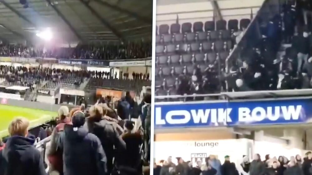 Chaos in Almelo: Fan valt uit uitvak en natúúrlijk mattende supporters op de tribune