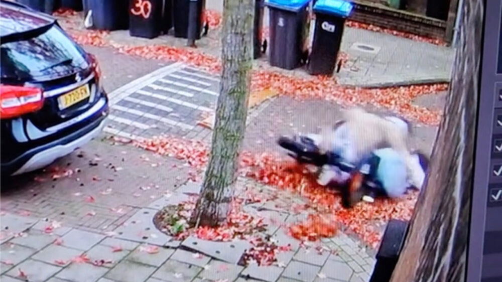 Camera filmt fatbikers die snoeihard onderuit gaan dankzij een hoopje bladeren