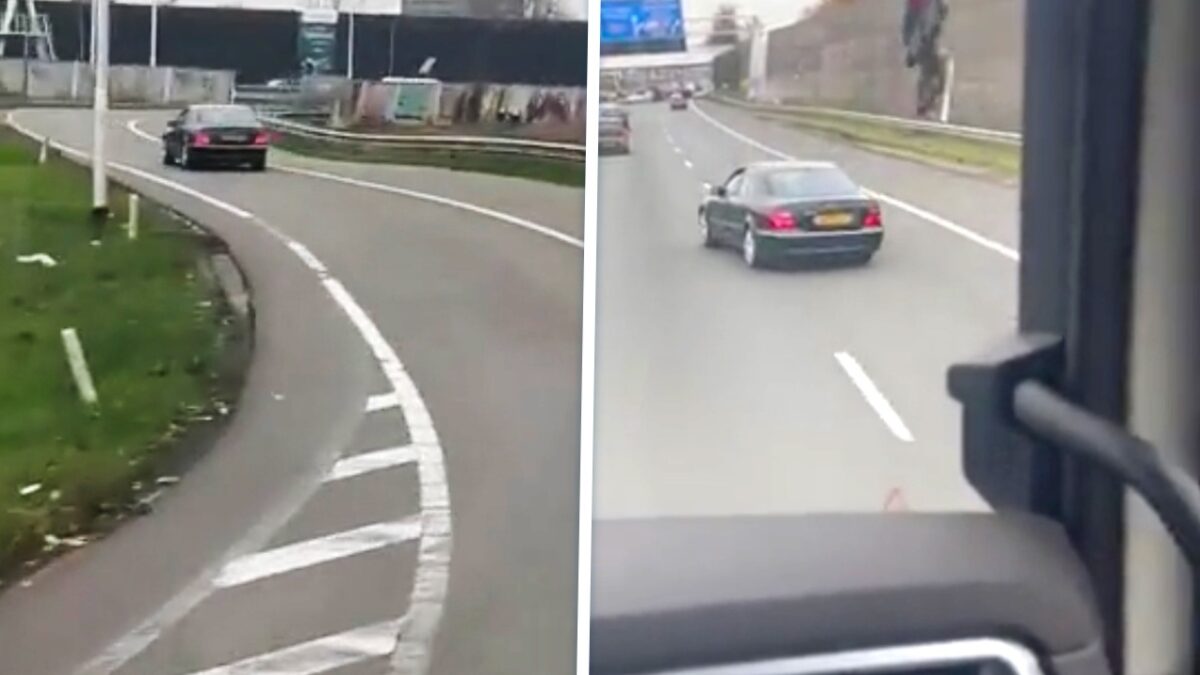 Tokkie in Mercedes trakteert vrachtwagen op ordinaire brake check en veroorzaakt bijna een klapper