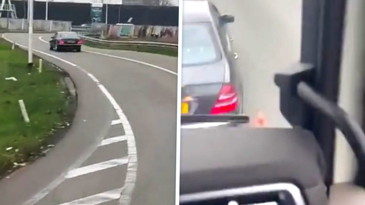 Tokkie in Mercedes trakteert vrachtwagen op ordinaire brake check en veroorzaakt bijna een klapper