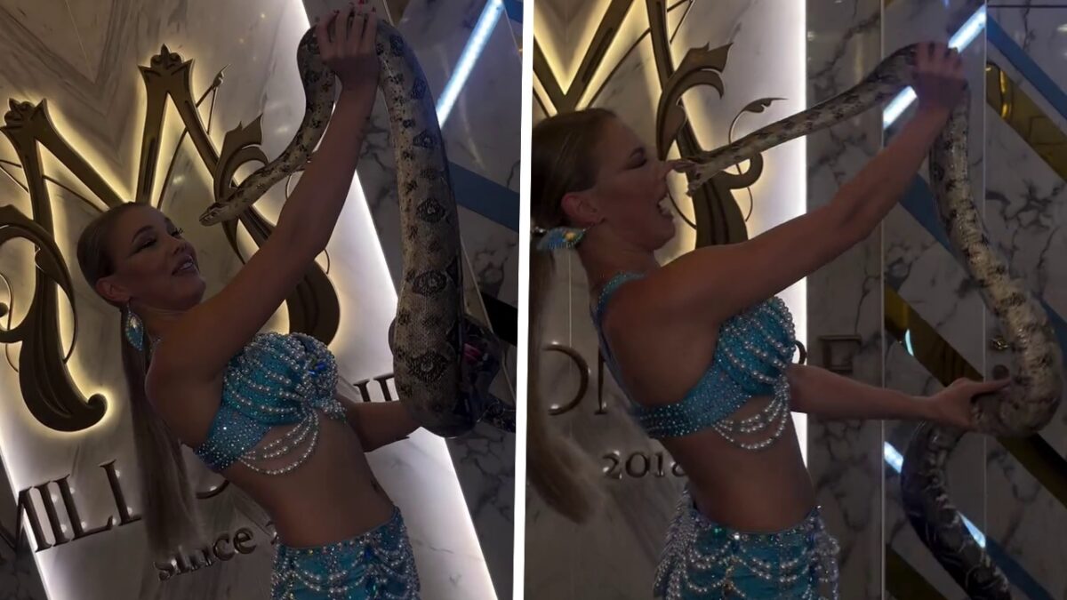 Russische slangenbezweerster krijgt een gepassioneerd kusje op d'r neus