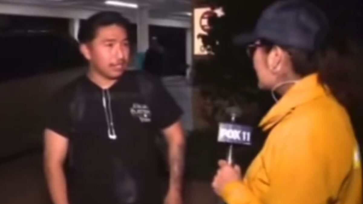 De journalist was verslag aan het doen over de hevige brand die de stad teisterde, toen plotseling een nieuwsgierige passant langs kwam wandelen. Deze man vond het blijkbaar nodig om zich in het nieuwsitem te mengen.