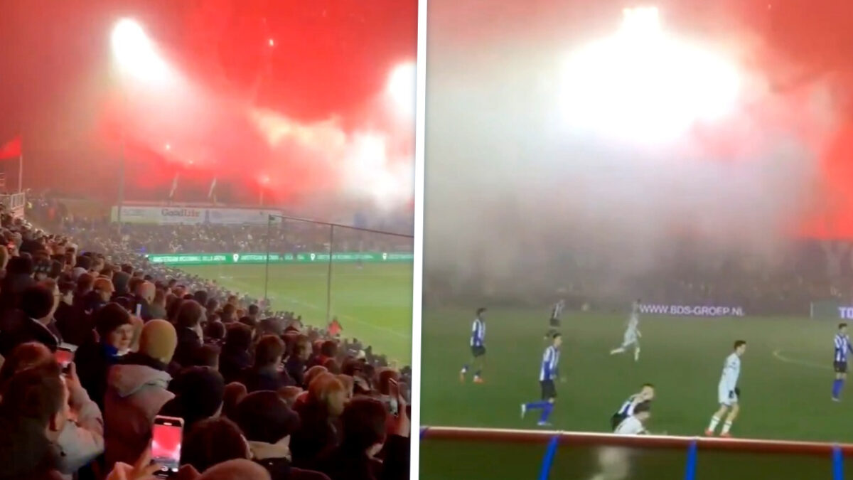 De wedstrijd tussen Quick Boys en SC Heerenveen werd al na 50 seconden stilgelegd. Quick Boys-supporters verzorgden een spectaculaire pyro- en vuurwerkshow.