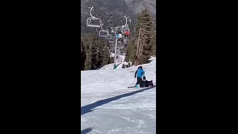 Geen flauw idee waar die ruzie over gaat, maar zodra de skiër met zijn stok naar een vermoedelijk jongere snowboarder uithaalt, duurt het niet lang voordat hij door een andere snowboarder wordt omgekegeld. STRIKE!