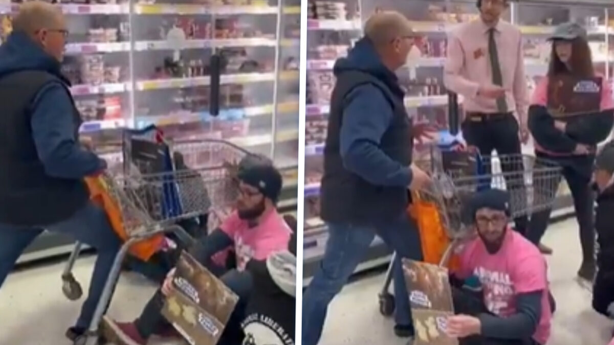 Man in supermarkt maakt korte metten met rebelse veganisten die toegang tot vleeswaren blokkeren