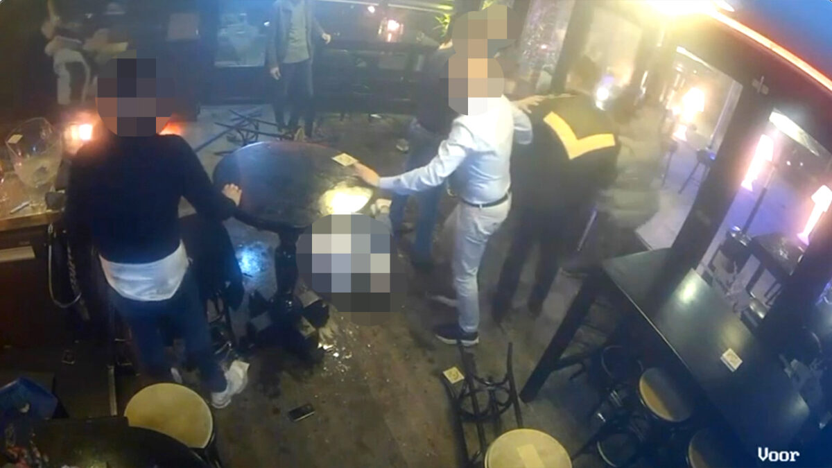 In de beelden is te zien, die ook bij de recherche bekend zijn, hoe de knokpartij begon toen een cafégast een vrouw sloeg. In de daaropvolgende chaos werden barkrukken als slagwapen gebruikt en vlogen zowel een glazen kandelaar als zoutvaatjes door de lucht.