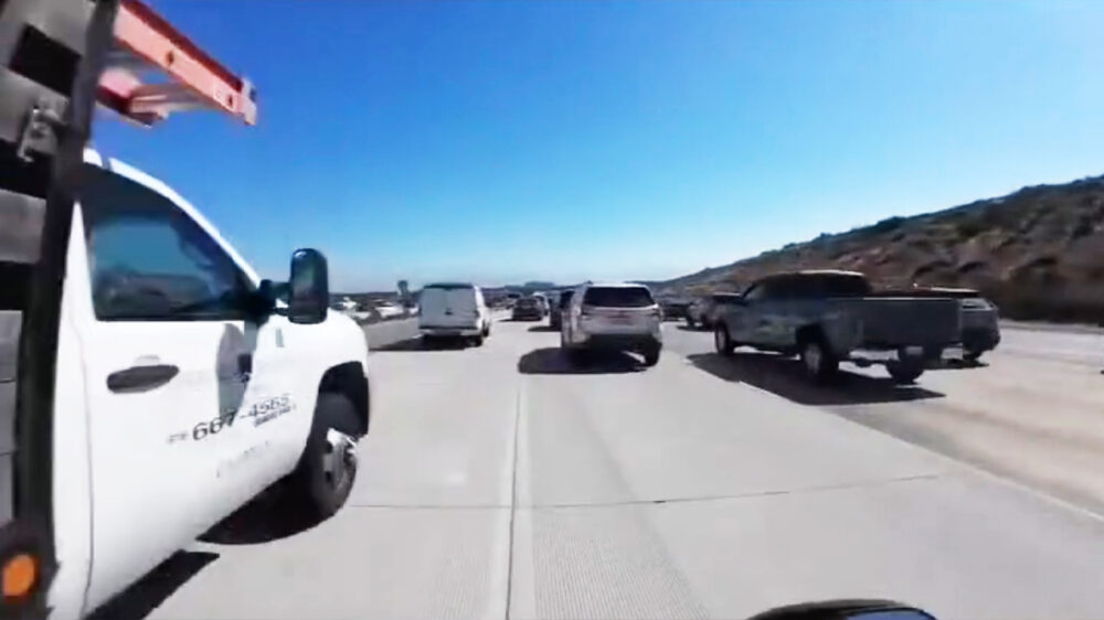 Amerikaanse motormuis racet als een bezetene door de file alsof zijn leven ervan afhangt