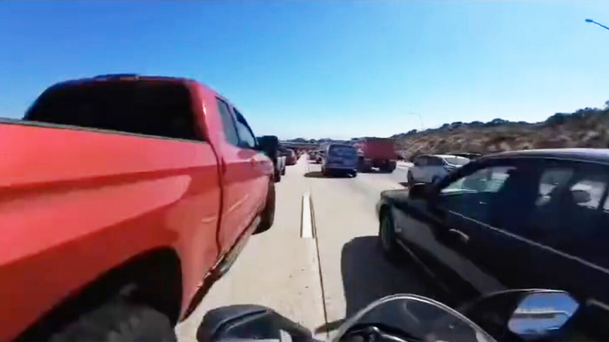 Amerikaanse motormuis racet als een bezetene door de file alsof zijn leven ervan afhangt