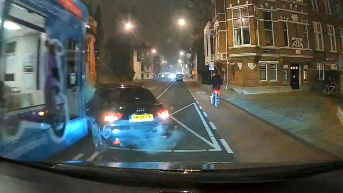 Audi A1 ontdekt dat je een wedstrijdje voorrang nemen altijd verliest van een Amsterdamse tram