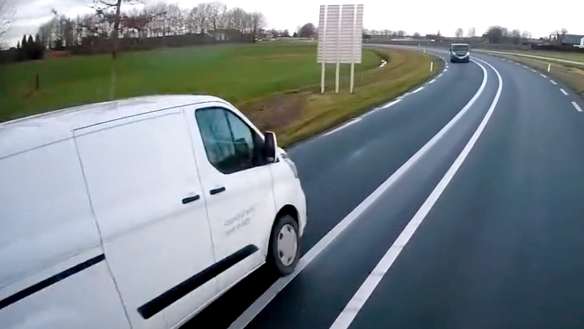 Onlangs zagen we al een idioot in een Corsa die tot nu toe de gevaarlijkste inhaalactie van 2025 maakte, maar deze verkeershufter in z'n witte busje (verrassend) doet er misschien wel een schepje bovenop. Het is dat er een paar millimeter speling was, maar de kans dat je zo'n frontale aanrijding overleeft is niet heel groot.