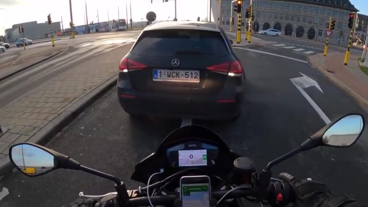 Een Belgische automobilist was even niet helemaal scherp en zette zijn bolide in zijn achteruit bij het stoplicht, waardoor hij een motorfiets raakte. Wat hij van plan was blijft een mysterie, maar goed het blijft een Belg dus laten we maar niet eens proberen om het te snappen.