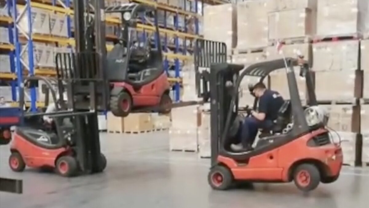 Een gerepareerde heftruck uitladen doe je natuurlijk in stijl: met 2 heftrucks Fails