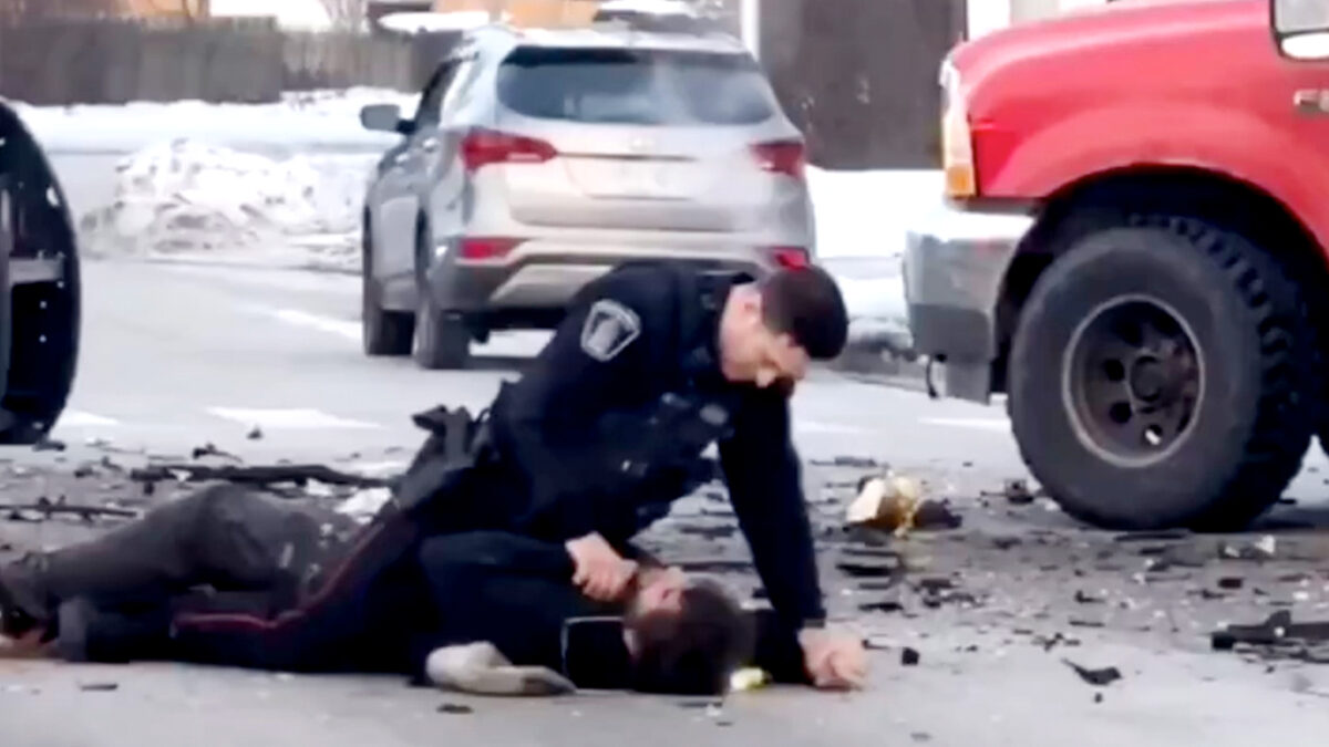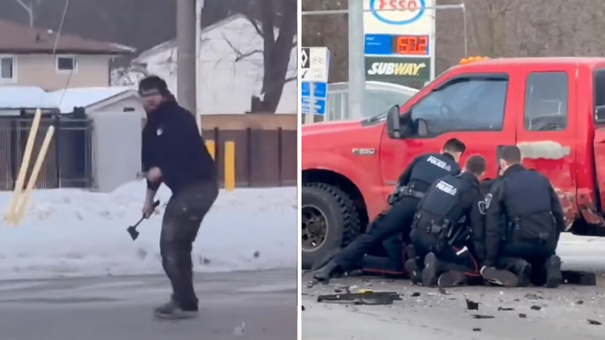 Bizarre beelden: Man met bijl getaserd en gearresteerd na gevecht met politieagent in Canada